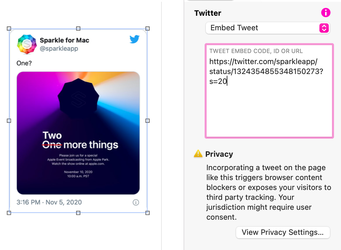 Si vous avez un bloqueur de publicité ou de contenu installé dans Safari, Twitter est supprimé de la page (car il suit les utilisateurs via des cookies), de sorte que le bouton Twitter ne sera pas visible dans l’aperçu ni sur le site publié. Désactiver le bloqueur ou ajouter l’aperçu de votre site à la liste blanche permettra d’afficher correctement le bouton Twitter.