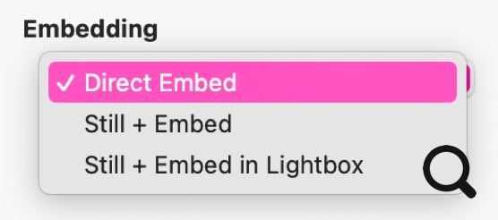 Image fixe + intégration dans une lightbox : semblable à ‘Image fixe + intégration’, sauf que le lecteur vidéo s’ouvrira dans une lightbox lorsque l’image fixe est cliquée.