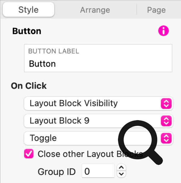 Quando utilizzi questa funzionalità, è una buona idea assegnare un ID di gruppo ai tuoi blocchi di layout: si tratta semplicemente di un numero che indica che il blocco di layout appartiene a un gruppo specifico di riquadri sulla pagina. Il valore predefinito è zero, ma puoi utilizzare qualsiasi numero a tua scelta. Il motivo per cui questo è importante è che, quando crei un link per rivelare il blocco, che si tratti di un normale link di menu o di un pulsante, avrai l'opzione di chiudere eventuali altri blocchi di layout sulla pagina quando il link viene cliccato. Chiaramente, se avessi due mega-menu collegati a due diversi link di navigazione, vorrei che solo uno apparisse alla volta. Pertanto, quando creo i miei link di navigazione, vorrei che il link chiudesse eventuali altri blocchi di layout prima di aprirne un altro. Assegnando ai miei blocchi di layout del mega-menu un ID comune, solo i riquadri che condividono quell'ID verranno chiusi. In altre parole, solo un mega-menu sarà visualizzato alla volta. Se non includo questo numero ID, cliccando su un link di un mega-menu potrei involontariamente chiudere TUTTI i blocchi di layout sulla mia pagina. Pertanto, mi assicurerò che tutti gli altri blocchi di layout abbiano un ID di gruppo diverso.