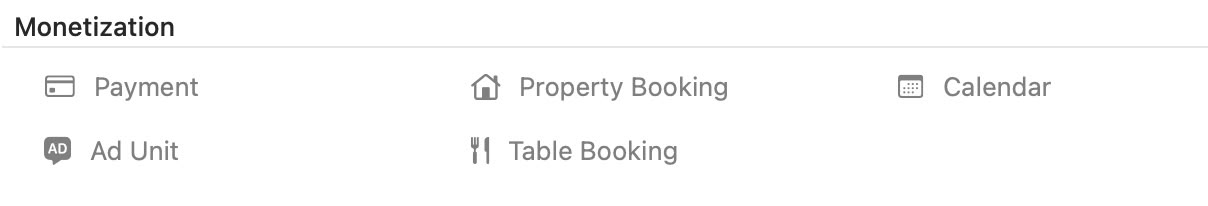 La sezione monetizzazione della toolbox contiene vari elementi che consentono l'integrazione con applicazioni di terze parti e includono l'accesso a gateway di pagamento popolari, app di prenotazione e calendario e l'aggiunta di Unità Pubblicitarie alle tue pagine web. Queste opzioni richiederanno l'accesso al tuo account con i fornitori di servizi pertinenti.