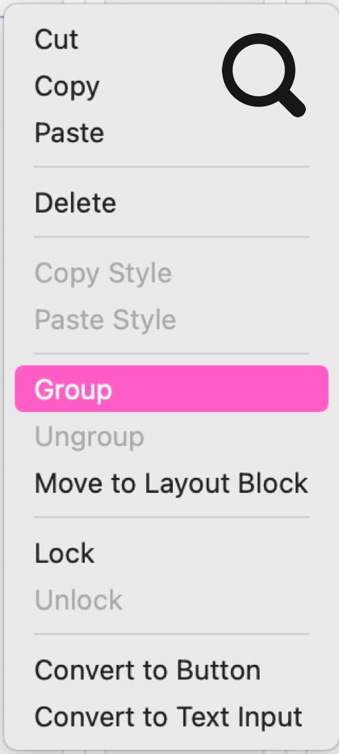 Puoi raggruppare più elementi in modo da poterli spostare e ridimensionare come un'unica unità. Per fare ciò, seleziona tutti gli elementi che desideri raggruppare, quindi fai clic con il tasto destro o usa il controllo e seleziona ‘Raggruppa’ dal menu contestuale. Puoi anche raggruppare gli elementi selezionandoli e utilizzando l'opzione di raggruppamento nel menu Disposizione di Sitely. Bloccare un elemento (compresi i gruppi) impedisce di spostarlo, modificarlo o eliminarlo accidentalmente, sia dal menu Disposizione che dall'ispettore di Disposizione.
