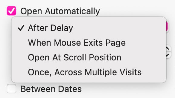 Apri Automaticamente ti consente di creare un popup che apparirà senza alcun intervento da parte dell'utente. Questo può avvenire dopo un periodo di tempo specifico, quando il mouse esce dalla pagina, al raggiungimento di una certa posizione di scorrimento, oppure puoi farlo apparire solo una volta, durante più visite al sito.