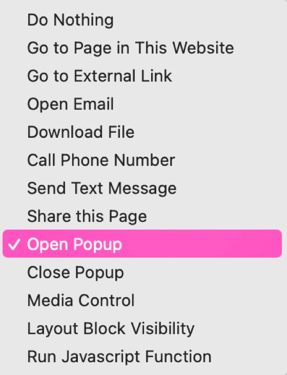 Per rendere i popup visibili nel tuo sito web, devono essere attivati da un'azione. Nella maggior parte dei casi, quell'azione sarà l'utente che clicca su un link di qualche tipo, che si tratti di un menu, un pulsante o un link di testo. L'azione al clic sarà Apri Popup. Quando selezionato, vedrai un'opzione aggiuntiva per selezionare il popup che desideri visualizzare.