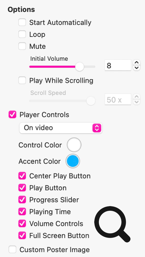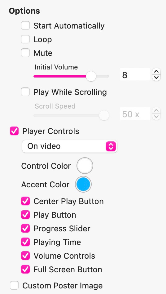 L'opzione "Avvio Automatico" permetterà al tuo video di iniziare a essere riprodotto non appena viene caricato nella pagina. Tuttavia, se imposti questa opzione, tieni presente che il video verrà riprodotto senza audio (sarà automaticamente silenziato). L'opzione "Loop" farà in modo che il video venga ripetuto, così non smetterà mai di essere riprodotto: quando raggiunge la fine, ricomincerà da capo. L'opzione "Riproduci Durante Scorrimento" riprodurrà il video mentre la pagina viene scorsa dall'utente: è una sorta di opzione "scrubber" video che avanza il video man mano che la pagina viene scorsa.