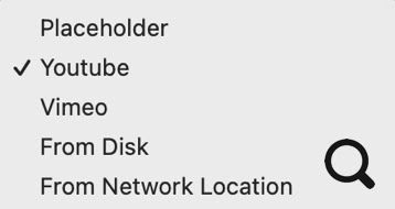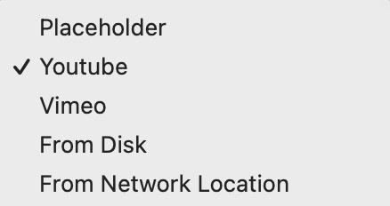 Potrebbe non essere consigliabile utilizzare servizi di streaming per fornire contenuti di sfondo - in particolare se il servizio è incline a fornire pubblicità insieme al tuo video. Per la maggior parte dei video di sfondo, è meglio ospitare il tuo video sul tuo server - utilizza le opzioni ‘Da Disco’ o ‘Posizione di Rete’.