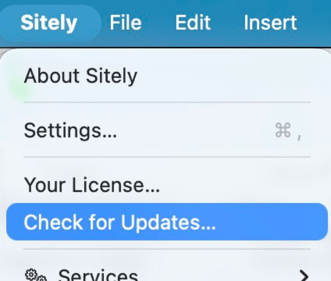 The simplest way to update Sitely is to start it, and if an update is available it will tell you. You can also select the “Check for updates” option from the Sitely menu.